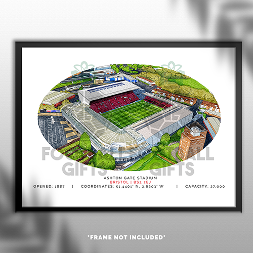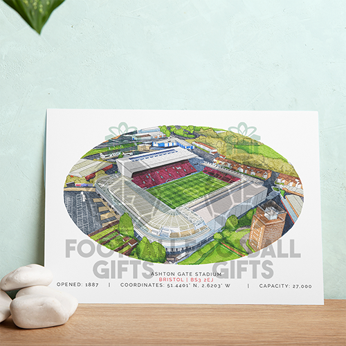 Each piece depicts a detailed print of a water colour painting of the stadium, with the stadium details printed underneath including the stadium name, capacity, grid coordinates & the year it was built.