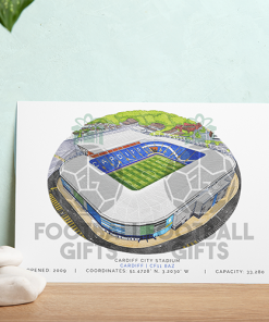 Each piece depicts a detailed print of a water colour painting of the stadium,  with the stadium details printed underneath including the stadium name, capacity, grid coordinates & the year it was built.