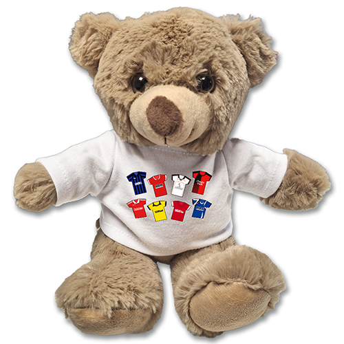 Featuring classic retro shirts from throughout the years printed on the bear’s t-shirt.