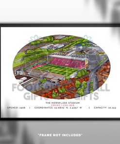 Each piece depicts a detailed print of a water colour painting of the stadium,  with the stadium details printed underneath including the stadium name, capacity, grid coordinates & the year it was built.