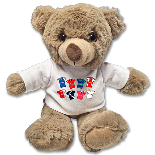 Featuring classic retro shirts from throughout the years printed on the bear’s white t-shirt.