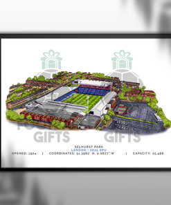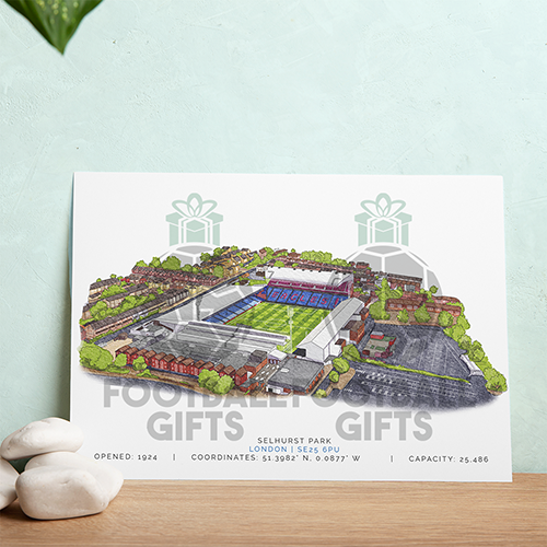 Each piece depicts a detailed print of a water colour painting of the stadium,  with the stadium details printed underneath including the stadium name, capacity, grid coordinates & the year it was built.
