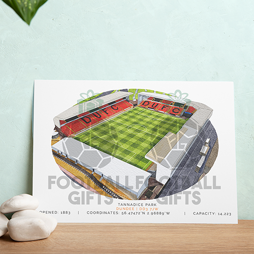Each piece depicts a detailed print of a water colour painting of the stadium,  with the stadium details printed underneath including the stadium name, capacity, grid coordinates & the year it was built.