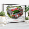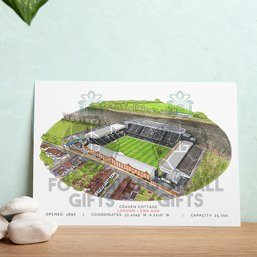 Each piece depicts a detailed print of a water colour painting of the stadium,  with the stadium details printed underneath including the stadium name, capacity, grid coordinates & the year it was built.