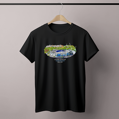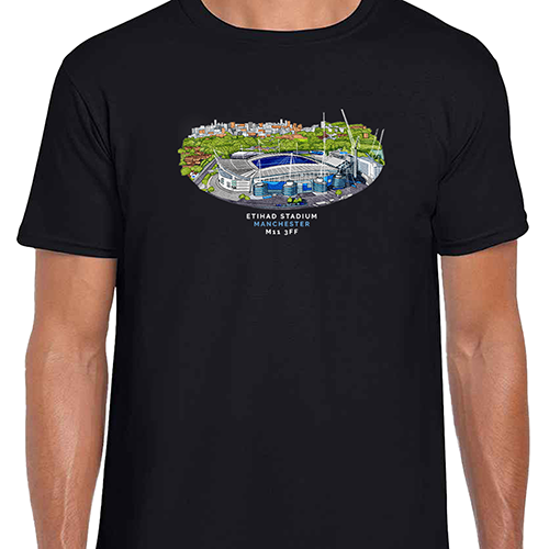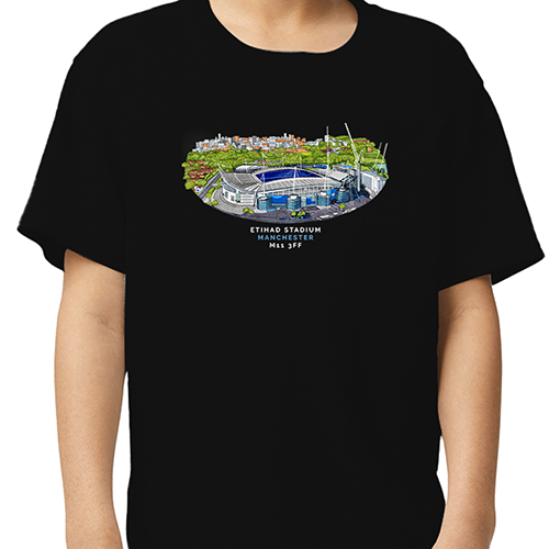 Man City Around The Grounds Etihad Stadium Water Colour Black T-Shirt
