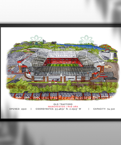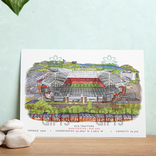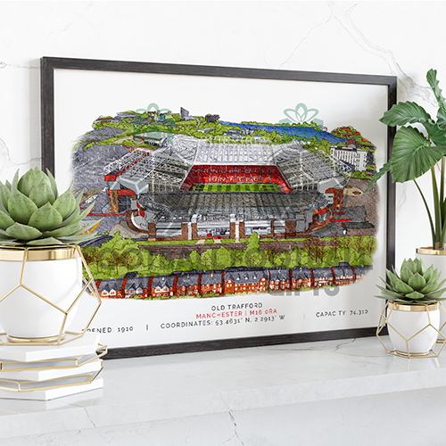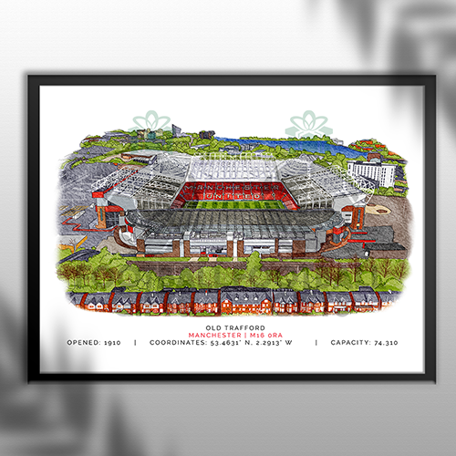 Each piece depicts a detailed print of a water colour painting of the stadium, with the stadium details printed underneath including the stadium name, capacity, grid coordinates & the year it was built.