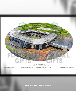 Each piece depicts a detailed print of a water colour painting of the stadium,  with the stadium details printed underneath including the stadium name, capacity, grid coordinates & the year it was built.
