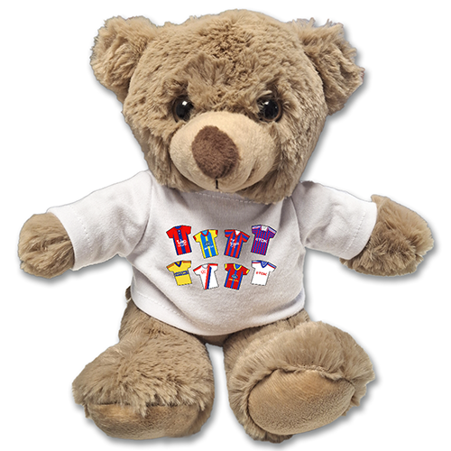 Featuring classic retro shirts from throughout the years printed on the bear’s white t-shirt.