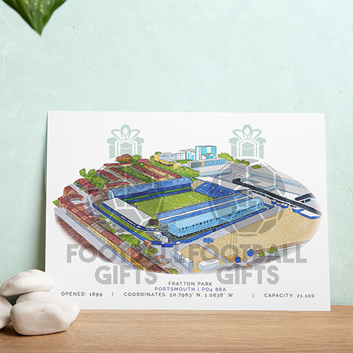 Each piece depicts a detailed print of a water colour painting of the stadium,  with the stadium details printed underneath including the stadium name, capacity, grid coordinates & the year it was built.