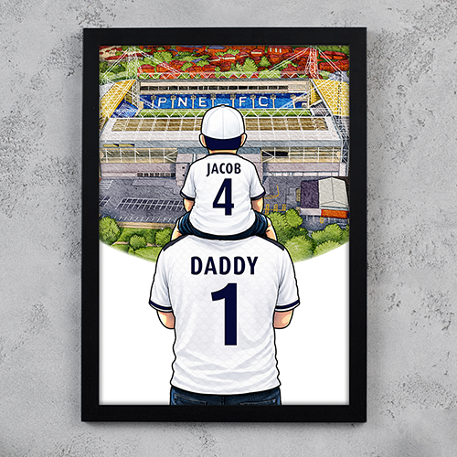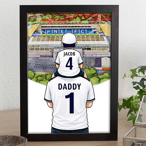 Each piece depicts a detailed print of a water colour painting of the stadium and an image of Father and Son that can be personalised with names and numbers of your choice.
