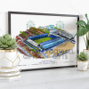 Each piece depicts a detailed print of a water colour painting of the stadium,  with the stadium details printed underneath including the stadium name, capacity, grid coordinates & the year it was built.