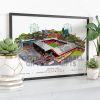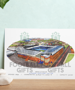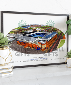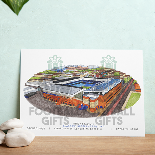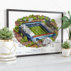 Each piece depicts a detailed print of a water colour painting of the stadium,  with the stadium details printed underneath including the stadium name, capacity, grid coordinates & the year it was built.