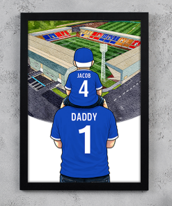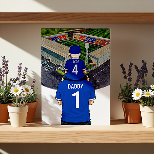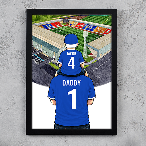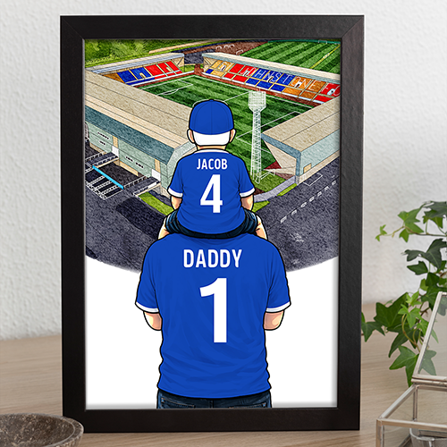 Each piece depicts a detailed print of a water colour painting of the stadium and an image of Father and Son that can be personalised with names and numbers of your choice.