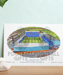 Each piece depicts a detailed print of a water colour painting of the stadium,  with the stadium details printed underneath including the stadium name, capacity, grid coordinates & the year it was built.