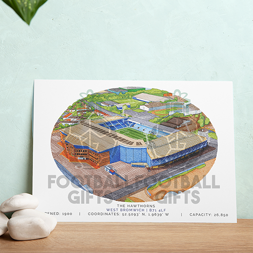 Each piece depicts a detailed print of a water colour painting of the stadium,  with the stadium details printed underneath including the stadium name, capacity, grid coordinates & the year it was built.