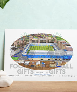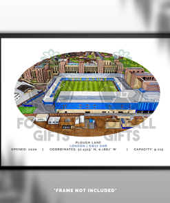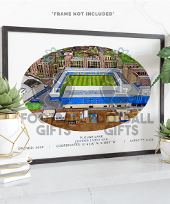Each piece depicts a detailed print of a water colour painting of the stadium,  with the stadium details printed underneath including the stadium name, capacity, grid coordinates & the year it was built.